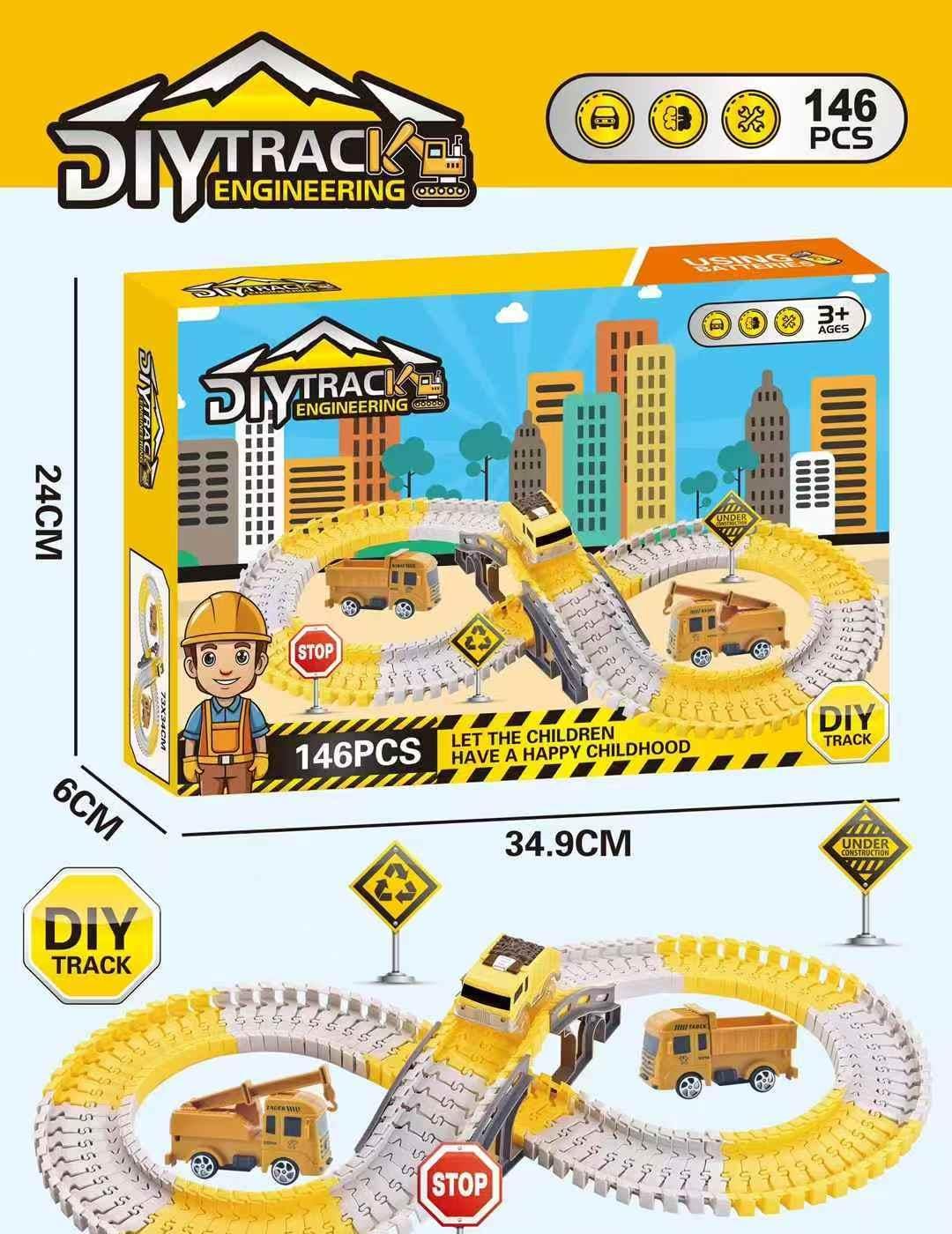 This playset features a customizable track system designed for construction vehicles like diggers and dump trucks, allowing children to build their own construction sites and engage in imaginative play. The flexible tracks enable various configurations, promoting creativity and problem-solving skills.