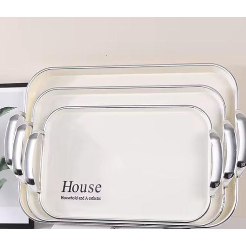 Elevate your dining table and kitchen with this exquisite Espresso Serving Tray Set of 3. These high-quality silver rectangular trays, adorned with designer golden handles, are perfect for both functionality and style.