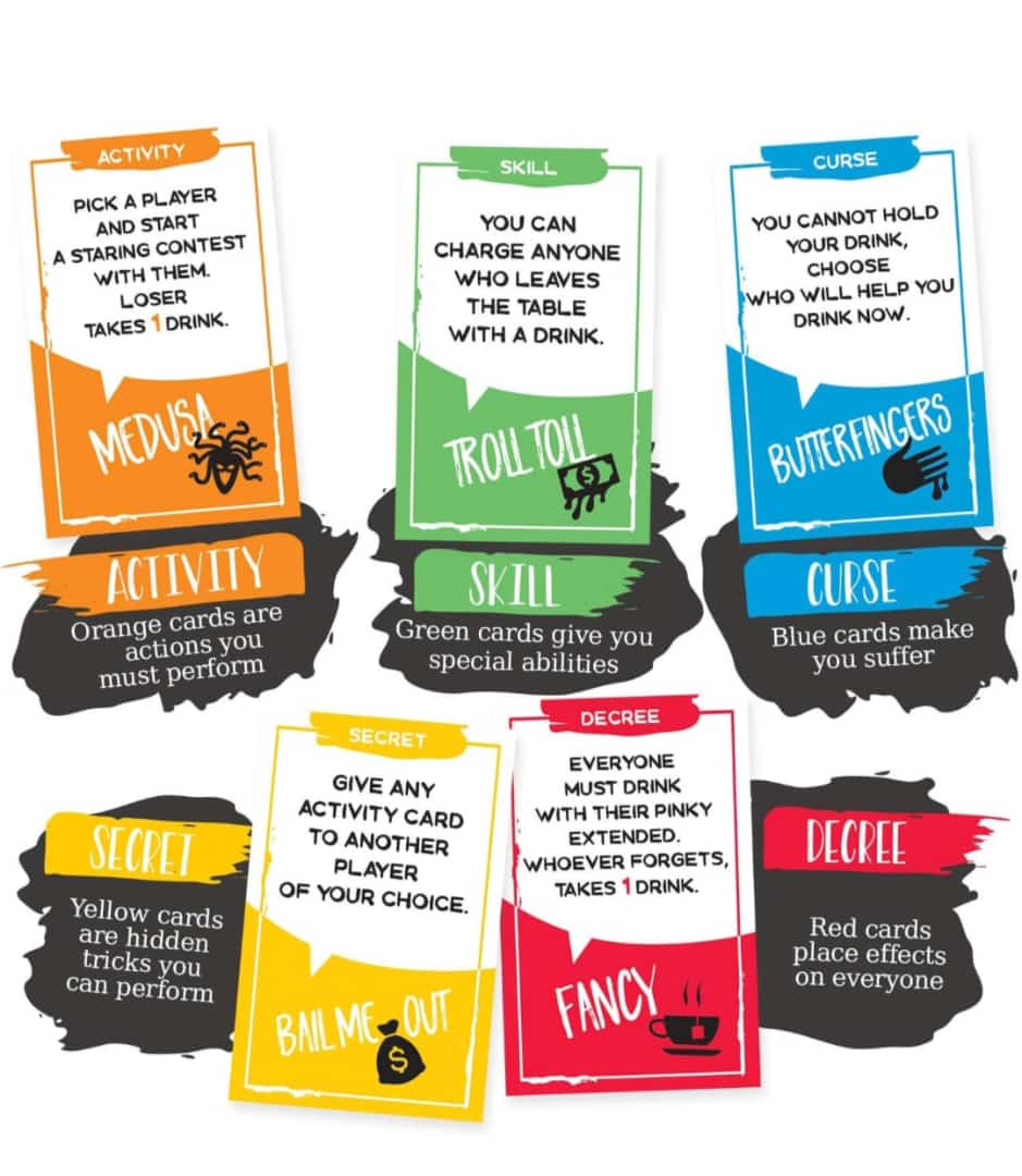 HOW TO PLAY: Compete with your friends and family by drawing a card in turn from the deck. There are 5 types of cards. Activity (Orange) cards are actions you must perform. Skill (Green) cards give you special abilities. Curse (Blue) cards make you suffer. Secret (Yellow) cards are hidden tricks you can perform. Decree (Red) cards place effects on everyone.