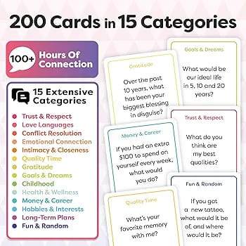 - NURTURE YOUR RELATIONSHIP – Each set includes 200 expertly crafted and thought-provoking questions to spark engaging and important conversations with your partner. With a wide range of topics, you’ll be able to get to know each other better, deepen your love and strengthen your relationship