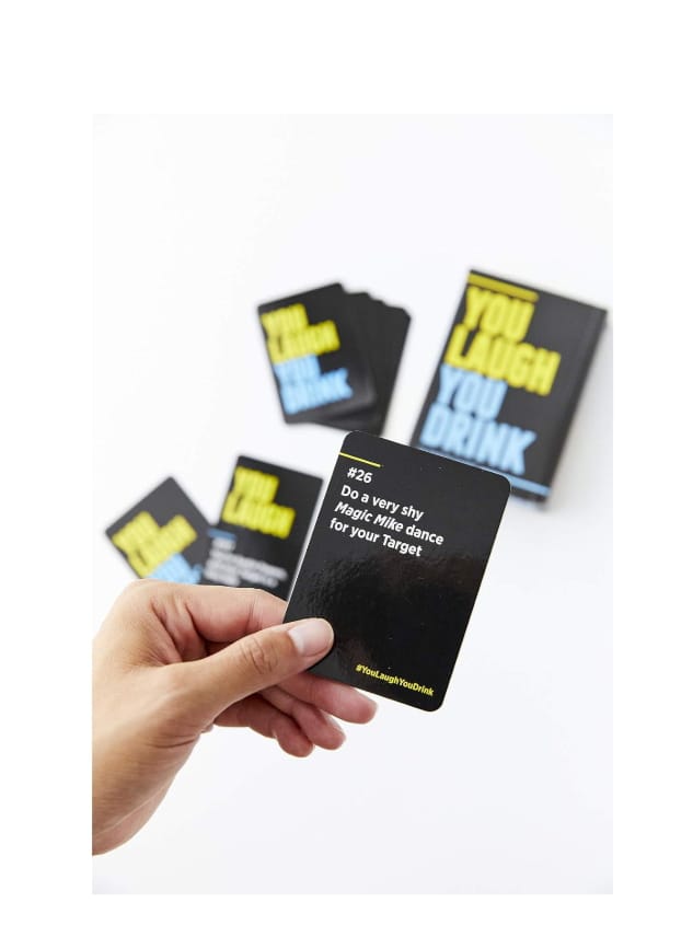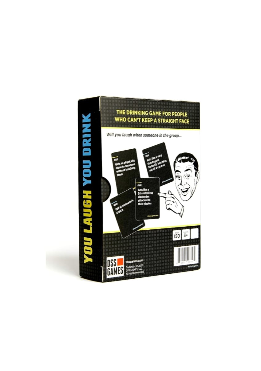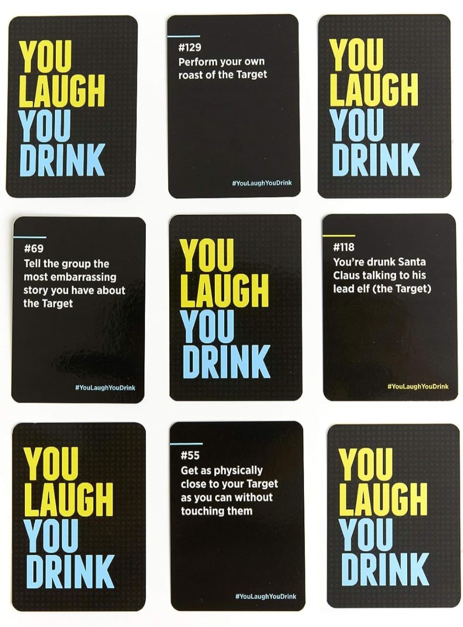 You Laugh, You Drink [A Party Game] is a drinking game for people who can’t keep a straight face. On their turn, players pick someone [a target] in the group and have 30 seconds to make them laugh. Do what the card says and don’t hold back!